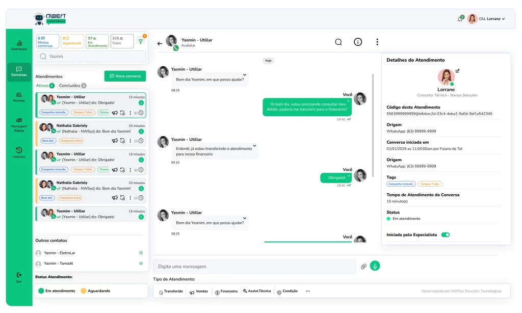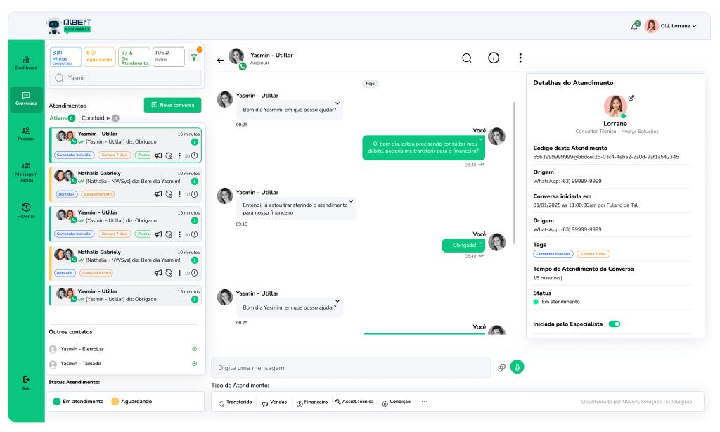 O atendimento pode ser transferido entre equipes sem perder o histórico. O cliente não precisa repetir nada.