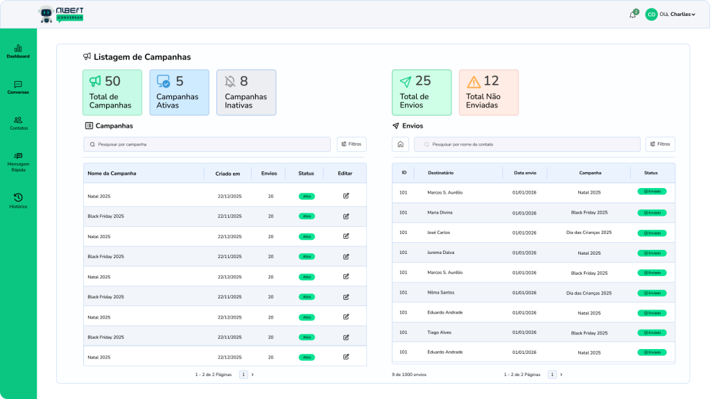 Integração nativa para buscar contatos e disparar campanhas direto do banco de dados do ERP.